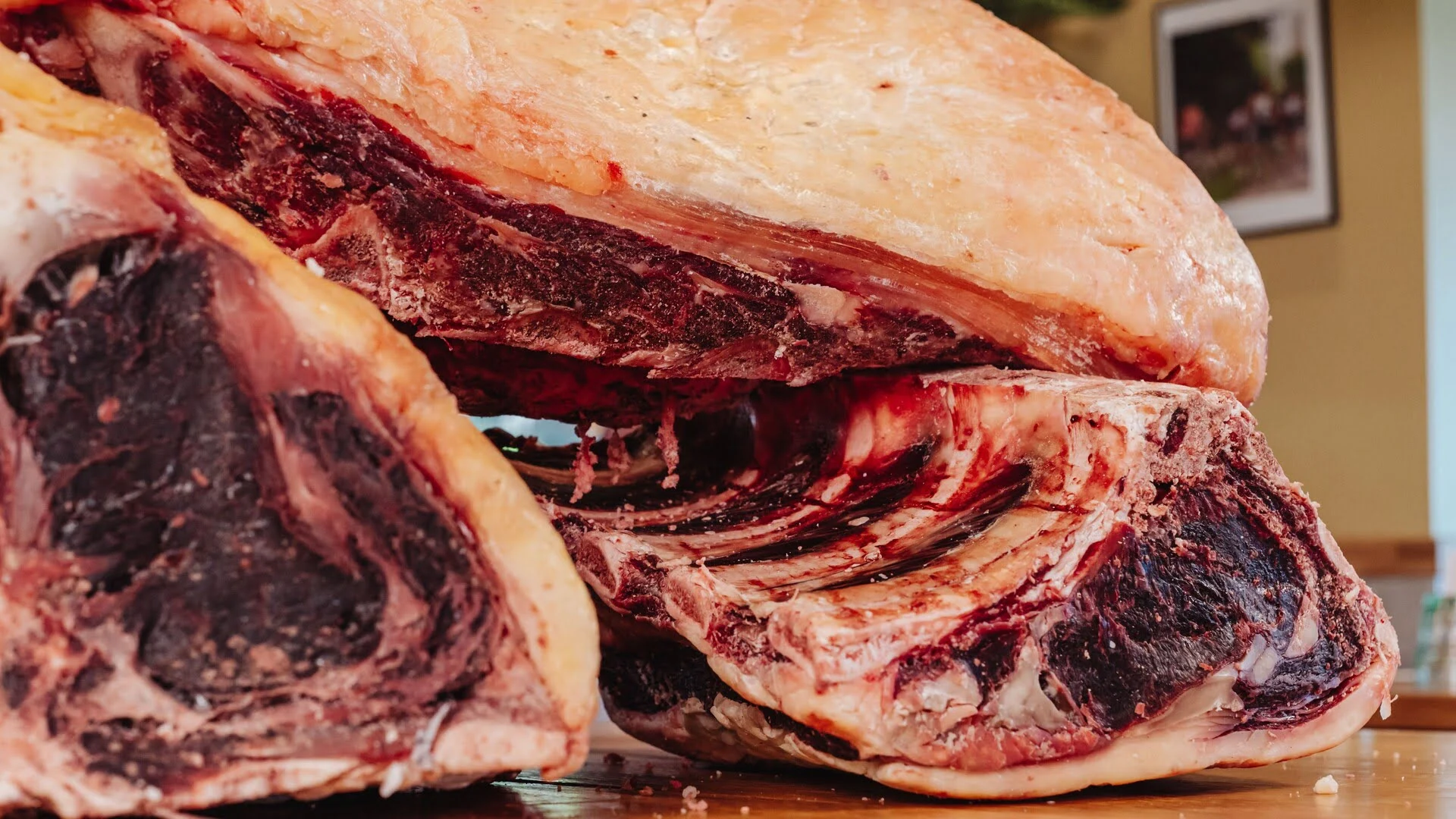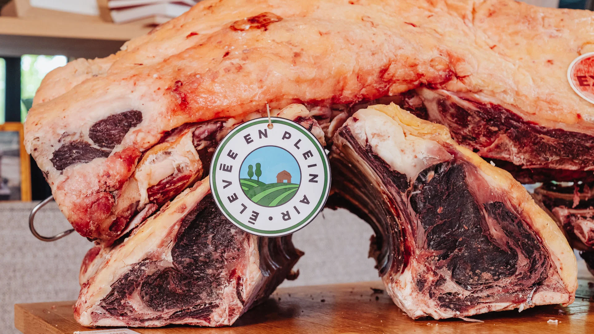 Rassurez-vous, vous n’allez pas manger cette carapace : avant la cuisson, nos chefs parent minutieusement la viande. Ils taillent et retirent cette croûte asséchée pour révéler un cœur de chair d’un rouge rubis éclatant, magnifiquement persillé et prêt à fondre en bouche. Tout le miracle de la maturation se passe ici, à l’intérieur !