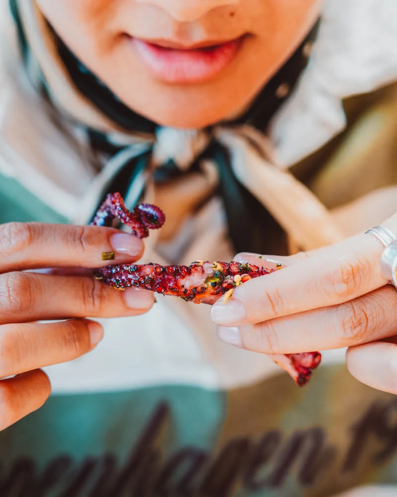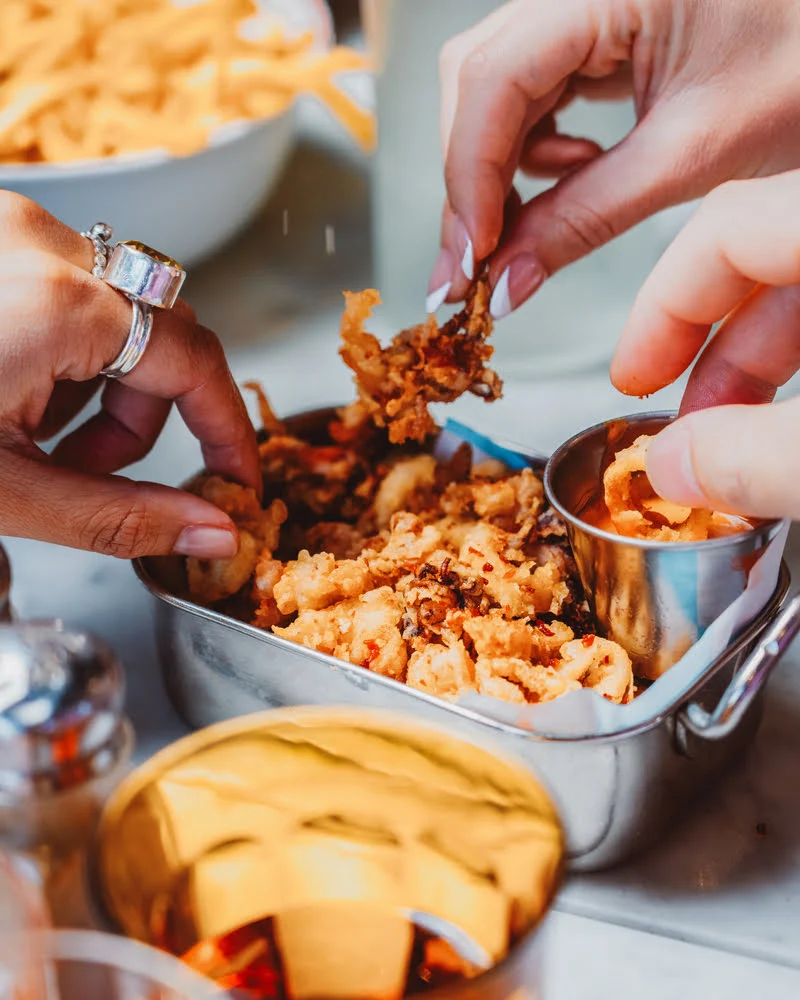 Notre grand classique en mode Terre et Mer : Des Chipirons frits croustillants, une mayonnaise spicy et toujours plus crousty avec notre chapelure de jambon ibérique.