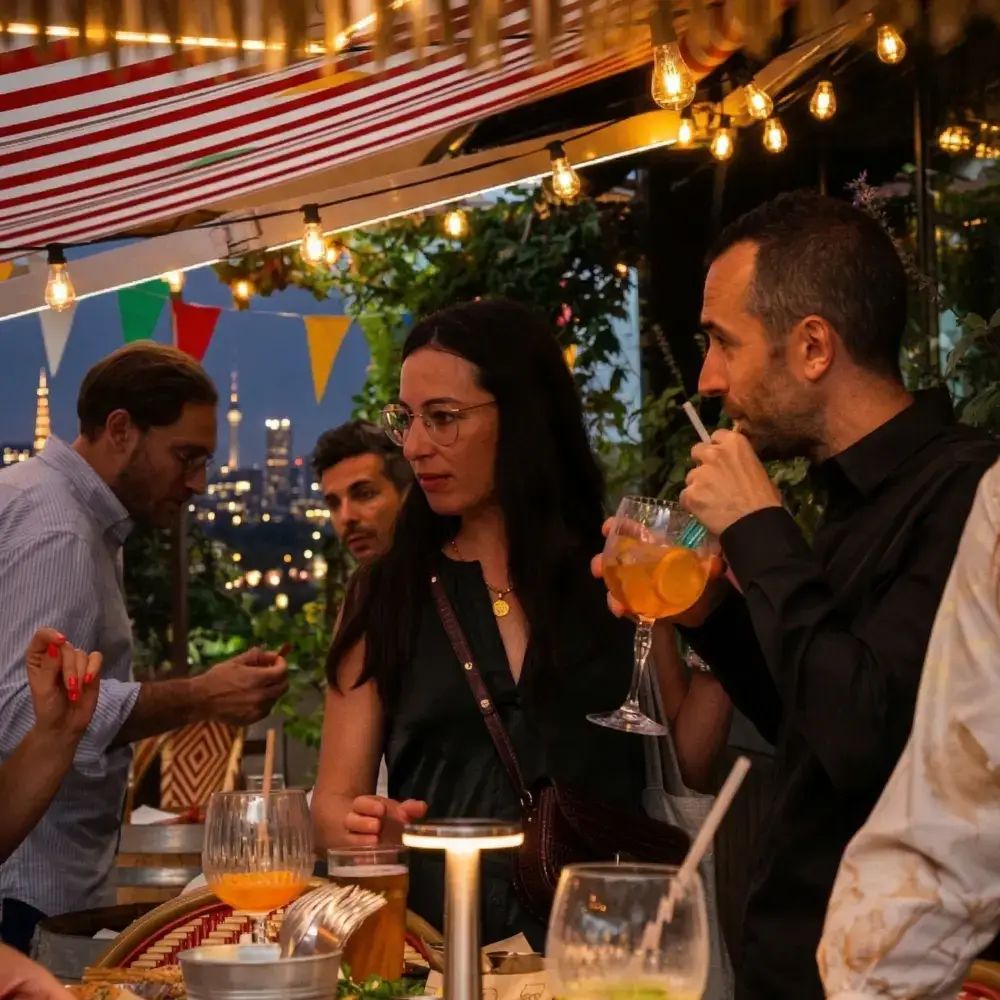L’énergie festive. Quand la lumière décline, le rooftop s’illumine.